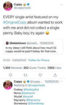 An old Tweet written by DJ Cuppy on Twitter confirmed that none of the featured artists in Cuppy’s album was paid. The throwback tweet was a response to a tweet made by a fan who wondered how much she paid Fireboy for him to have featured in her album.